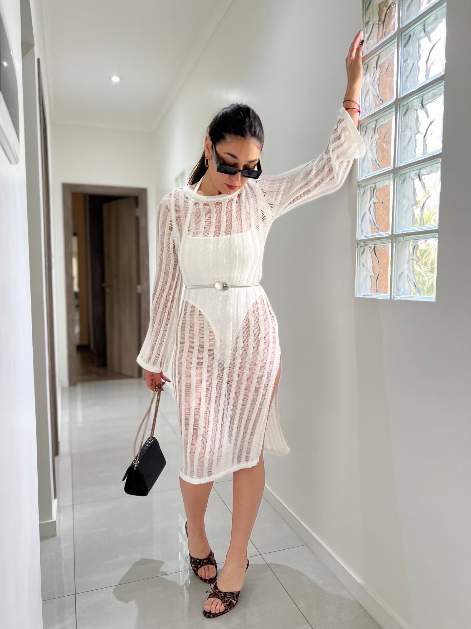 Vestido ligero y fresco, perfecto para días de sol. Su diseño calado y color blanco aportan un estilo relajado y veraniego. Ideal para usar sobre la malla o para un look playero cómodo y elegante.