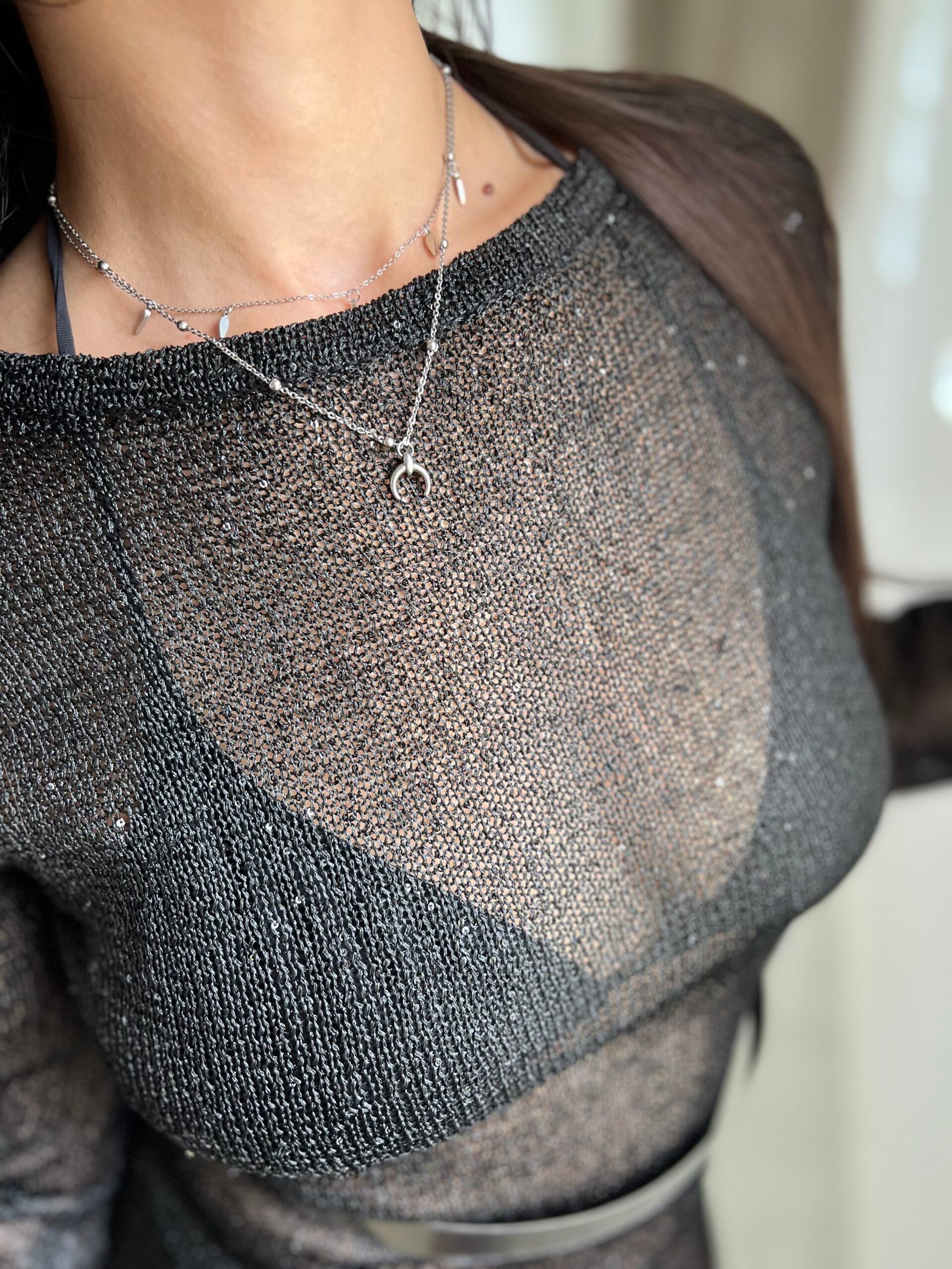Elegante y moderno, este vestido negro con brillos aporta un toque de glamour ideal para eventos y noches especiales. Su diseño favorecedor resalta la silueta mientras los destellos añaden sofisticación y estilo. Perfecto para lucir un look impactante y chic.